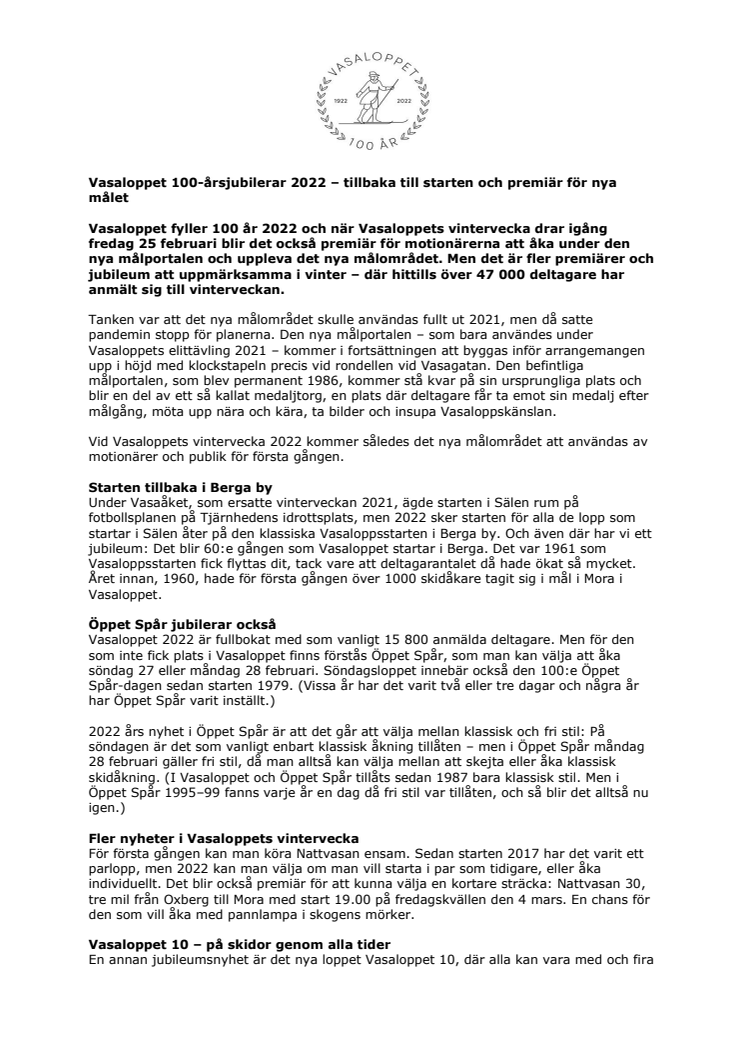 En sammanfattning med nyheter, information och program inför Vasaloppets vintervecka 2022.