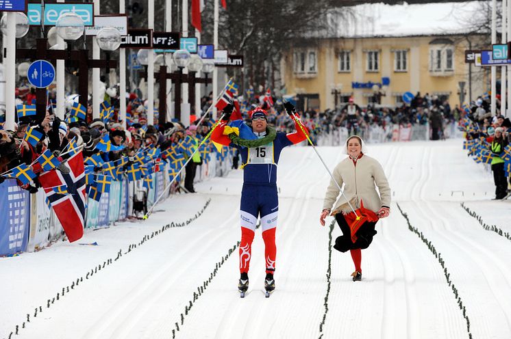 Daniel Tynell vann 2009 års Vasalopp och gratuleras av kranskullan Sandra Brander. Foto: Vasaloppet