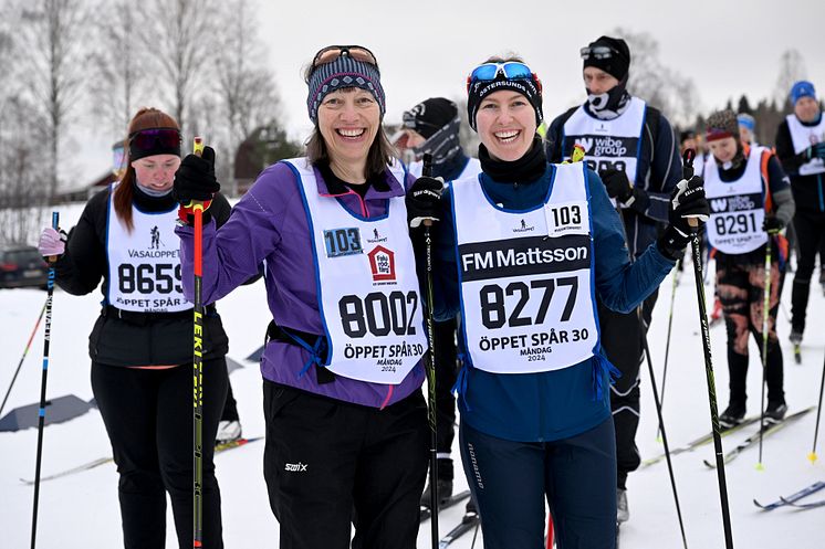 Två deltagare i Öppet Spår måndag 30 2024 åker med nummer 103 på nummerlappen, som en hyllning till Margit Nordin, den första kvinnan som åkte Vasaloppet 1923.
