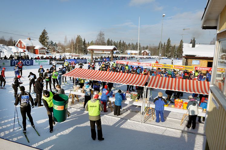 Över 8000 Öppet Spår-åkare hade en fin dag, med ypperliga förhållanden och bra spår i dag den 27 februari 2011. Här är kontrollen i Evertsberg efter 47 av de 90 kilometrarna.