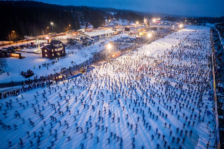 Nära 10 000 deltagare släpptes i väg från Berga by i Sälen under söndagsmorgonen i Öppet Spår söndag 2025.