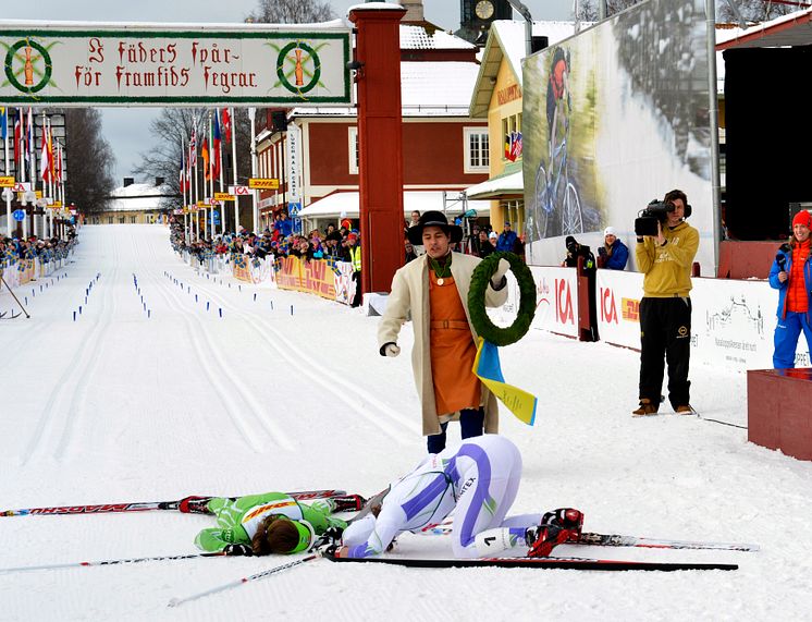 Susanne Nyström, Laisvalls SK, vann TjejVasan 2013 efter en spurtuppgörelse med Laila Kveli (i grön dräkt till vänster). Det var Susannes sjätte seger i världens största skidlopp för tjejer! Årets kransmas heter André Gatu.