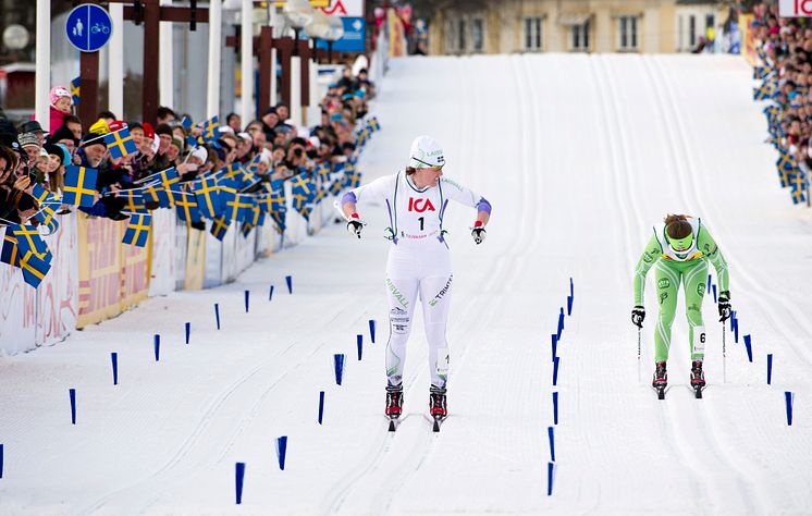 Susanne Nyström, Laisvalls SK, vann TjejVasan 2013 efter en spurtuppgörelse med Laila Kveli (till höger). Det var hennes sjätte seger i världens största skidlopp för tjejer!