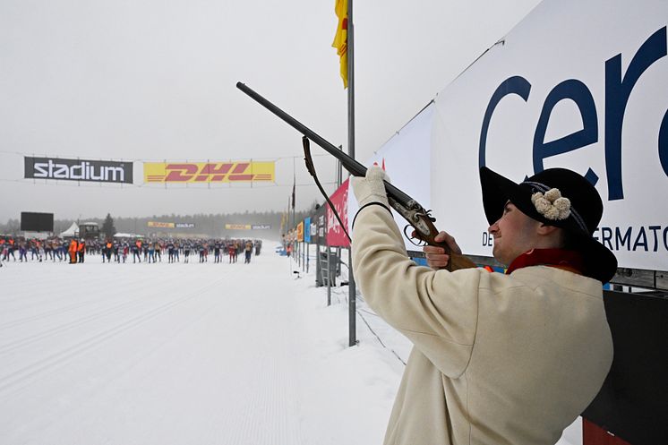 Kransmas Arvid Jerkgård skjuter i väg startskottet för Tjejvasan 2025. 6500 tjejer var anmälda i det som är världens största skidlopp för enbart kvinnor.