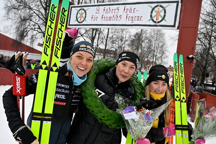 Jenny Larsson, Lager 157 Ski Team, (i mitten) vann Tjejvasan – världens största skidlopp enbart för kvinnor – före Louise Lindström, Team Eksjöhus (till vänster), och Norges Julie Kvale Støstad, Team Ramudden (till höger).