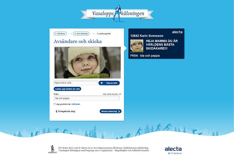 I dag lanserar Alecta Vasaloppshälsningen där alla kan skicka hälsningar till skidåkare i Vasaloppets vintervecka 2013. Hälsningarna kommer att visas ute på stora skärmar längs spåret.