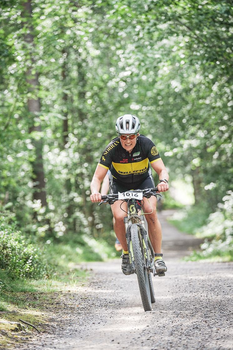 Helena Törnelius, Skellefteå, är en av två kvinnor som genomfört Vasaloppstrippeln 90 2025 hela åtta gånger. Här i Cykelvasan Öppet Spår 2025.