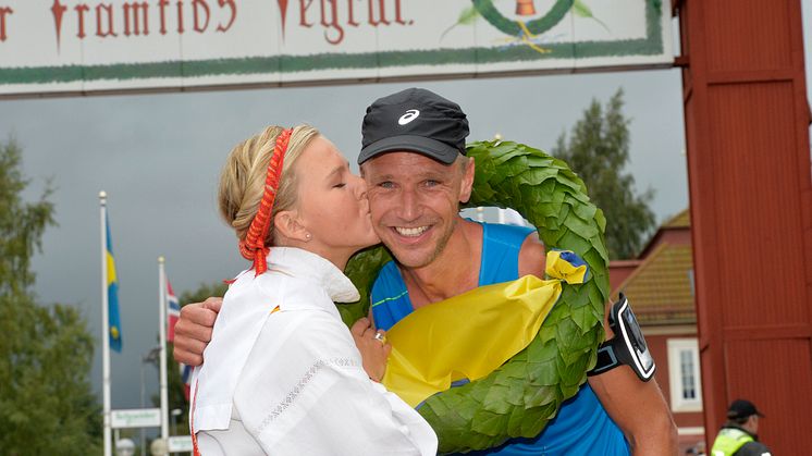 Jonas Buud vann UltraVasan 2014. Kranskulla Lisa Englund.