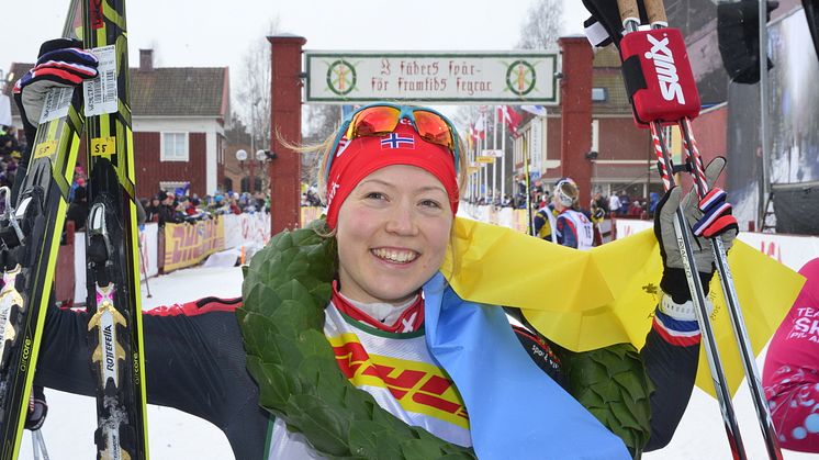 Laila Kveli, Norge, segrade i TjejVasan 2015. 10 000 tjejer hade anmält sig för att skida de tre milen från Oxberg till målet i Mora. Världens största skidlopp bara för tjejer! Kransmasen heter Victor Gustafsson. Foto: Vasaloppet.